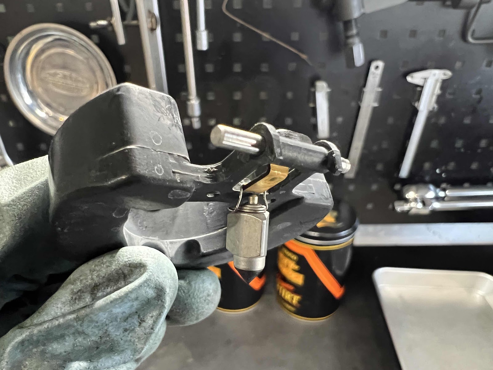 フロートバルブを乗せている真鍮の小さなプレート部分は油面を調整するためのものです