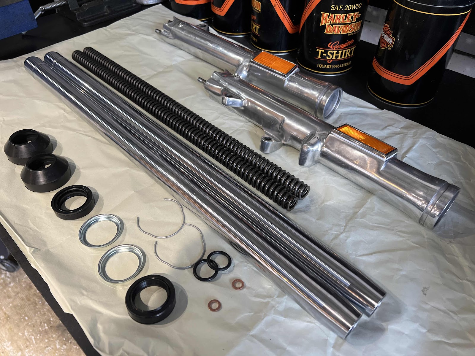 オーバーホールしたフロントフォークは2インチオーバーのインナーチューブに組み替えます
